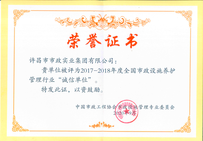 此外,許昌市政集團還被評為2017-2018年度“全國市政設(shè)施養(yǎng)護管理行業(yè)誠信單位”。